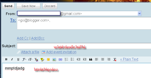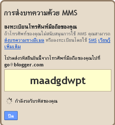 ส่ง MMS จากมือถือโดย เนื้อหา ใส่ รหัสที่แสดงให้ถูกต้อง โดยส่งมาที่ Gmail ของเรา ไม่ใช่ go@blogger.com นะครับ