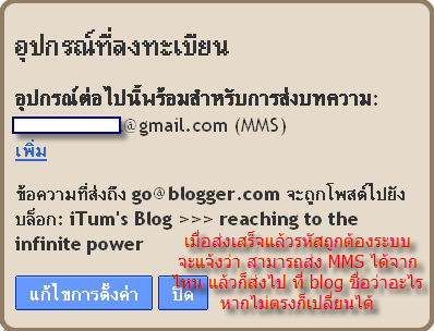 4.เมื่อระบบได้รับอีเมล์รหัสและตรวจสอบแล้วว่าถูกต้องก็จะแสดงหน้าต่างดังนี้ ว่าสามารถส่ง MMS เพื่อโพสข้อความเข้าสู่ blogger ได้ ซึ่งก็คืออีเมล์ Gmail ของเรานั่นเอง