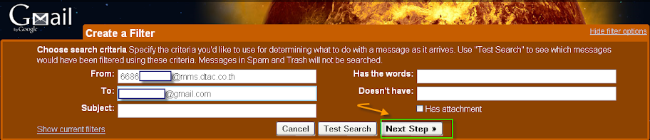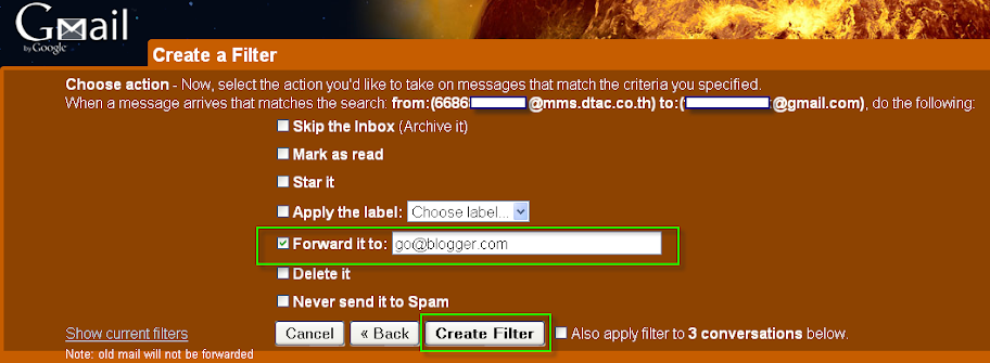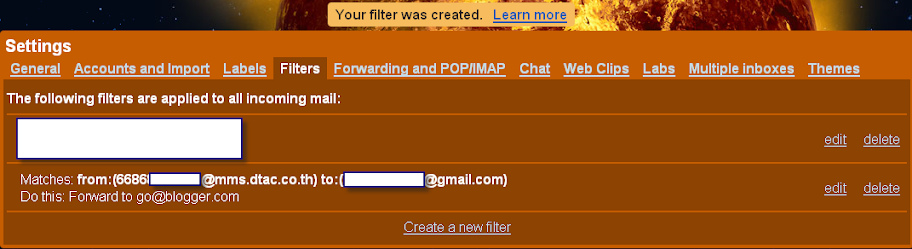 5.กำหนด filter ใน Gmail เพื่อให้ forword อีเมล์ ที่ส่งมาจาก 668XXXXXXXX@mms.dtac.co.th ไปยัง go@blogger.com